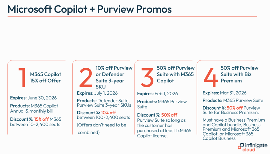 Keeping up with compliance and data governance is simpler than ever thanks to an updated Microsoft 365 Purview Suite promotion, now optimised for use alongside Microsoft 365 Copilot. Valid till 1st February 2026, this 50% off offer ensures your customers can safeguard sensitive data and maintain regulatory compliance, all while leveraging the intelligent productivity features of Copilot. The promo applies to Microsoft 365 Purview Suite. The customer must also have at least one Microsoft 365 Copilot license, as well as the standard prerequisites for attaching Purview Suite.