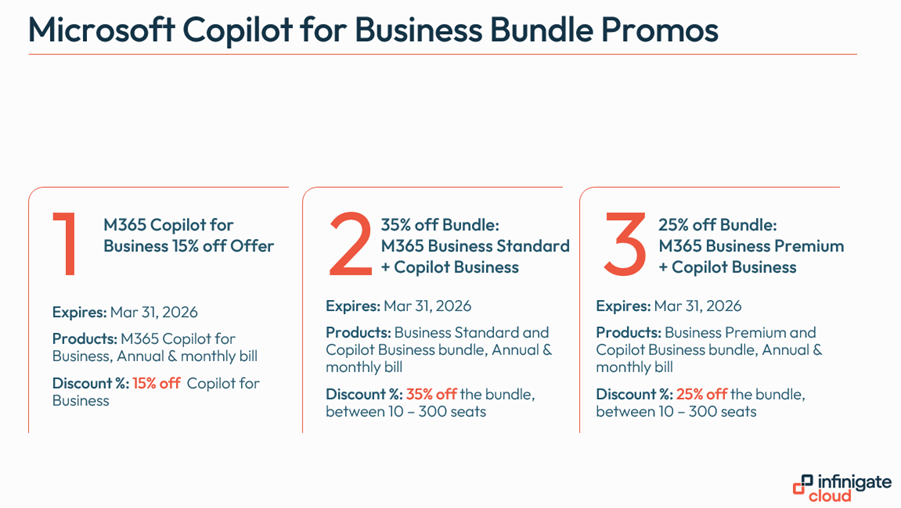 For customers who require enhanced security and device management, the Microsoft 365 Business Premium and Copilot Business bundle is the ideal choice. With up to 25% off valid till 31st March 2026, this promotion delivers advanced protection, device management, and AI-powered productivity in one comprehensive package. Your customers benefit from seamless integration, improved compliance, and meaningful savings all essential ingredients for business success in today’s digital-first world.